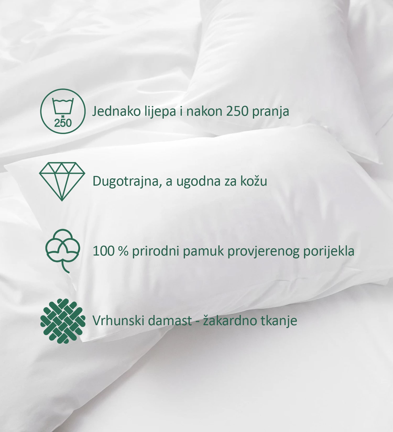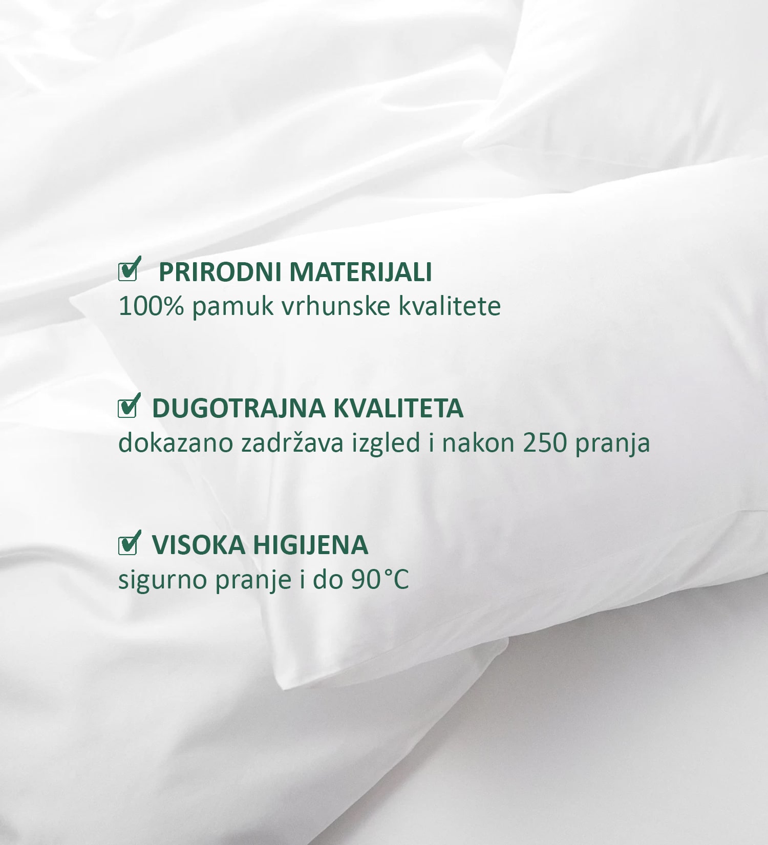 • Preporučujemo glačanje posteljine. Osim dodatne dezinfekcije proizvoda, glačanjem ćete najlakše oblikovati proizvod i podariti mu dodatnu udobnost. Pamučnu posteljinu najbolje je glačati dok je još pomalo vlažna.
